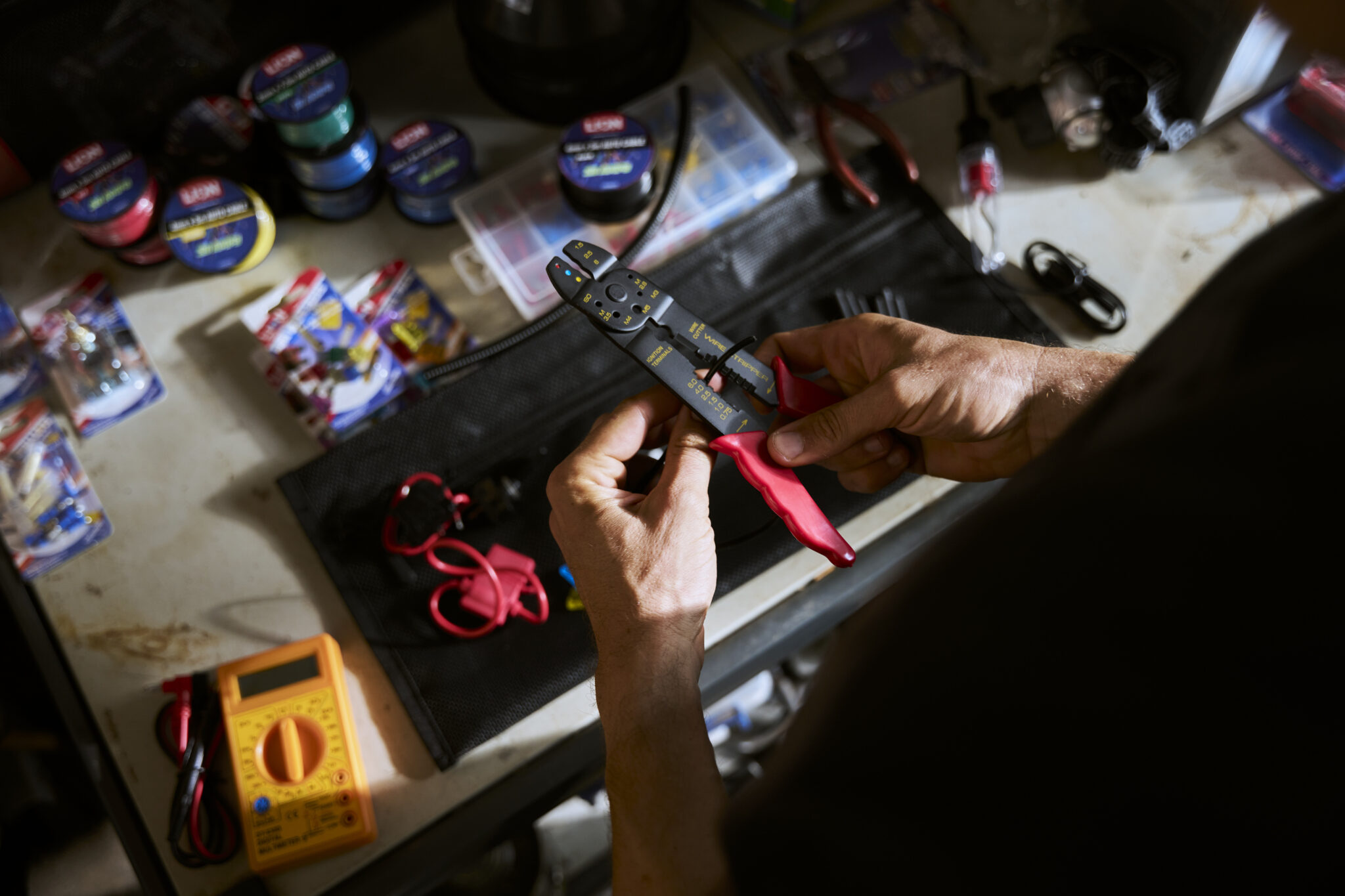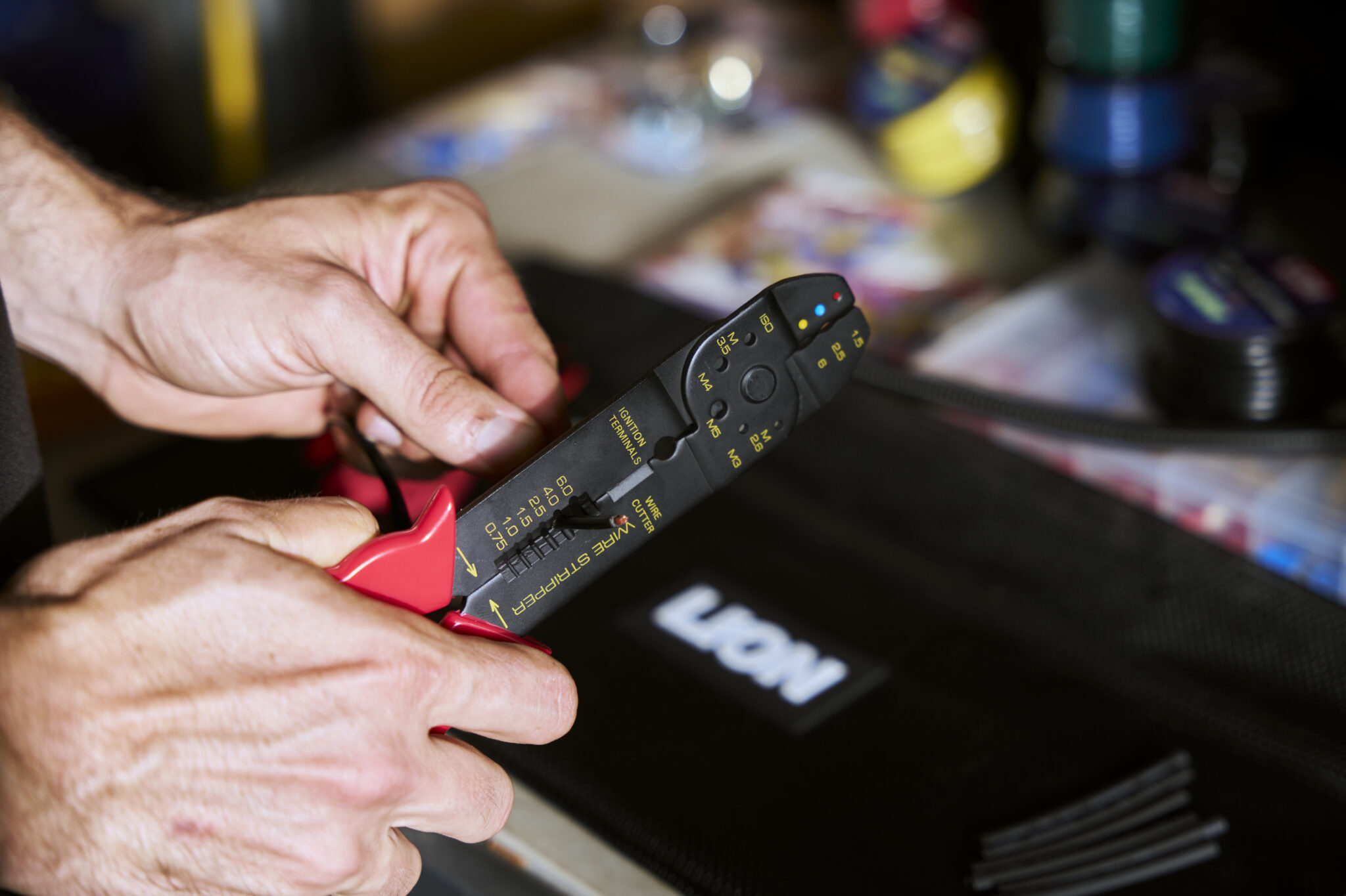 Size: 200mm. Crimping tool with wire cutter, wire stripper 0.75mm to 6mm, screw cutters M2.6 – M5, crimpers and ignition terminal crimper. Insulated plastic handles.